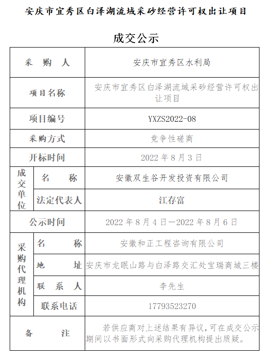 安慶市宜秀區(qū)白澤湖流域采砂經(jīng)營許可權出讓項目 成交公示